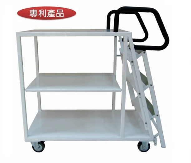 2. 穏固之三層梯架收合設計,方便高處之取物;另,梯架連接腳輪煞車,增加取物之安全性。